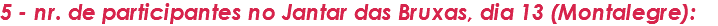 inscrição na saída fotográfica à Sexta13 Montalegre a realizar nos dias 13 e 14 de setembro de 2019 Inscrições até 14 agosto 2019 Custos estimados (podes inscrever-te em só algumas destas atividades): - estadia: 55 € (sócios MDV : 45 €) / pessoa com pequeno almoço incluído (a ser pago conjuntamente com a inscrição, desistências apenas mediante troca ou preenchimento por lista de espera) - deslocação: 17 € ida e volta com base em 4 pessoas por viatura - jantar das bruxas (facultativo): 25 € ementa completa da sexta 13 – a ser pago diretamente no restaurante - almoço Pitões das Júnias (facultativo): 30 € – a ser pago diretamente no restaurante - jantar dia 14 (facultativo): 25 € – a ser pago diretamente no restaurante A ModusDeVer, MDV associação cultural, está a dinamizar para os seus associados, que se podem acompanhar de familiares, uma saída fotográfica a Montalegre para participar e fotografar no famoso e galardoado Sexta 13 em Montalegre (Noite das Bruxas), convidando todos os que queiram ir a este evento a fazer a sua inscrição. Este evento realiza-se desde 2002 sempre que uma sexta feira calha num dia 13, o que em 2019 só acontecerá nos meses de setembro e dezembro, embora este último com grande probabilidade de frio intenso e neve, pelo que setembro aparece como a data de eleição para participar e fotografar este cenário cheio de fantasia, cor e alegria em que o Município de Montalegre aposta para ganhar. Programa: 13/09/2019 (sexta feira) - saída à hora do almoço com destino a Montalegre - distribuição pelos alojamentos - jantar das bruxas em restaurante temático em Montalegre (facultativo) - participação nas atividades da sexta 13 (Noite das Bruxas) 14/09/2019 (sábado) - após pequeno-almoço, saída com destino a Pitões das Júnias para uma visita pelo local - almoço regional em Pitões das Júnias (facultativo) - regresso ao Porto com paragem para jantar (facultativo) Horas e pormenores, bem como programa completo a informar mais próximo da data do evento. A MDV reservou vários quartos em alojamento local, na zona de Montalegre (até uma distância máxima de 12 Km da vila), em quartos duplos (cama de casal) e 1 triplo. Alguns quartos têm casa de banho privativa e outros são com casa de banho partilhada. A MDV fará a distribuição do alojamento pelos participantes. Preço do alojamento e pequeno almoço por pessoa é de 45 euros, valor que terá que ser creditado na conta da MDV na altura da reserva, sem o que a mesma não é assegurada. A deslocação será feita em carros partilhados com despesas a dividir, pelo que se pede a quem tem disponibilidade de levar o carro que o informe assim que possível. Na inscrição deverão confirmar se vão participar no jantar das bruxas, no almoço em Pitões das Júnias e no jantar de regresso, afim de garantirmos as reservas. Lembramos que nesta época todos os restaurantes esgotam com muita antecedência, pelo que não garantimos lugar a reservas posteriores. 50% do valor previsto para as refeições terá que ser creditado na conta da MDV para a mesma ser efetiva. Nota importante: dado ser um evento livre e que a MDV se limita a gerir a partilha de transportes e pré reservar alojamento e a alimentação sem qualquer intuito comercial, não está disponibilizado nenhum seguro para o evento. Inscrições Aceitam-se inscrições até à totalidade do alojamento e transporte disponível, pelo que se pede que o façam com brevidade. Esgotadas as inscrições, aceitam-se ainda algumas inscrições para uma lista de espera em função de alguma desistência. Lembramos que aquando da inscrição deverão depositar para a conta da MDV associação cultural (IBAN PT50 0033 0000 4548 9727 5120 5) o valor do alojamento, transporte e 50% do valor previsto das refeições em que vão participar. Relembramos que os valores dados para o transporte e refeições são por estimativa. Desistências, após 15 de agosto só serão possíveis desde que seja possível substituir o participante. Até àquela data contactar a MDV para avaliarmos se há lugar a alguma perda do valor depositado, mas dentro do possível, tentaremos devolver na totalidade os valores adiantados. A inscrição deve ser feita enviando o formulário ao lado. Para qualquer questão contacte p.f. : Mónica Pinho monicapinho@modusdever.com telemóvel : 917125585 Bons momentos fotográficos